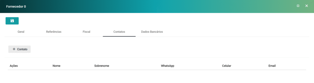 Esta tela irá carregar diversas abas e campos para que você preencha os dados cadastrais do Fornecedor, após preencher você poderá salvar os dados clicando em no canto superior esquerdo. E assim você terá cadastrado um novo Fornecedor.