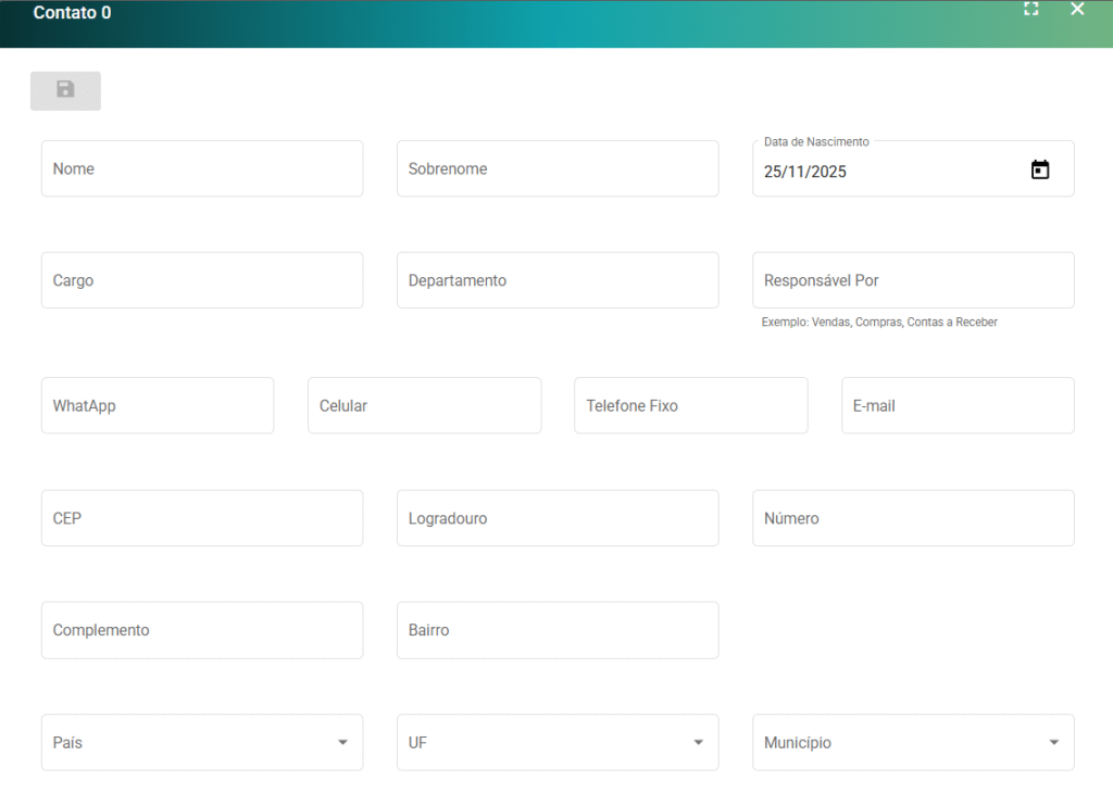 Preencha os dados do contato, logo após, você poderá salvar os dados clicando em no canto superior esquerdo;