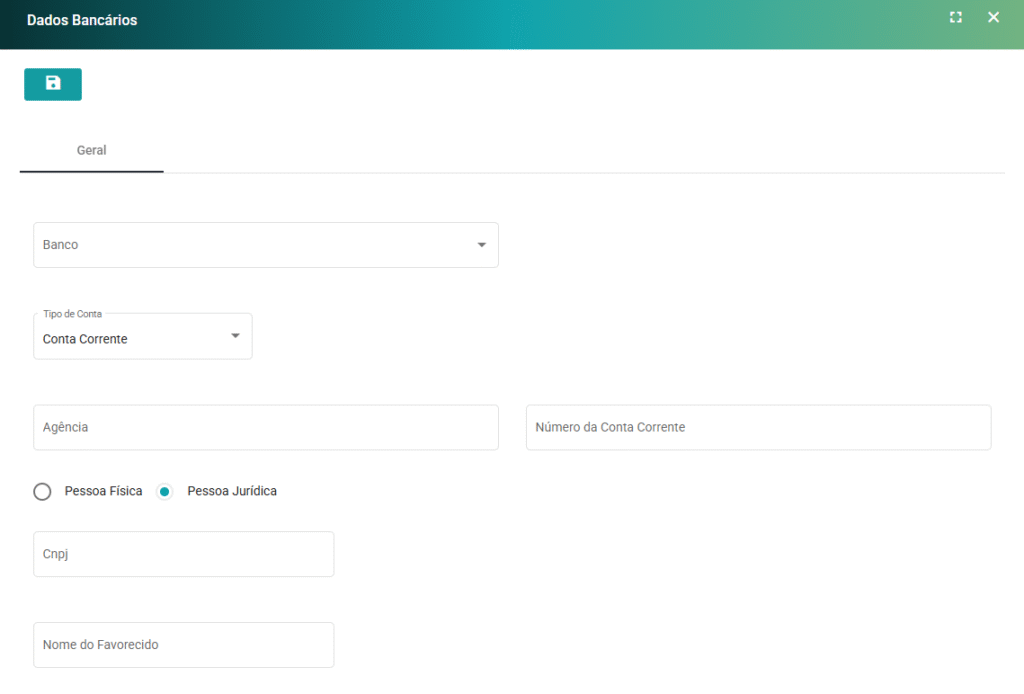 Clicando em uma nova tela de cadastro será carregada para que você preencha os dados bancários, após preencher você poderá salvar os dados clicando em no canto superior esquerdo;